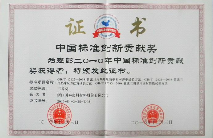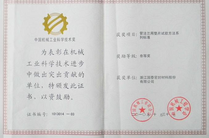 2010年10月30日,beat365密封“管法兰用垫片试验方法系列标准”获得中国机械工业科学技术三等奖;同年12月3日,GB/T 12622-2008 管法兰用垫片压缩率和回弹率试验方法、GB/T 12621-2008 管法兰用垫片应力松弛试验方法、GB/T 12622-2008 管法兰用垫片密封性能试验方法,获中国标准创新贡献奖三等奖。