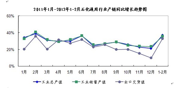 2012年2月,全国石化通用行业完成工业总产值1,128.23亿元,同比增长37.12%,环比增长22.61%;完成销售产值1,078.99亿元,同比增长35.8%,环比增长21.56%。