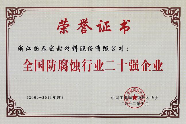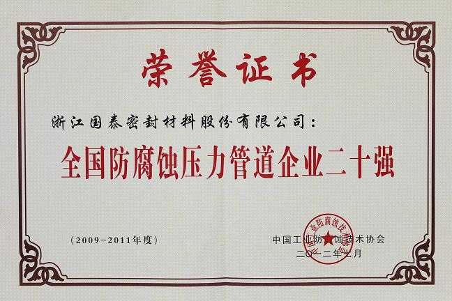 beat365密封荣获“2009-2011年度全国防腐蚀行业20强企业”(综合排名第七)和“2009-2011年度全国防腐蚀压力管道企业20强”(综合排名第二)两项荣誉。
