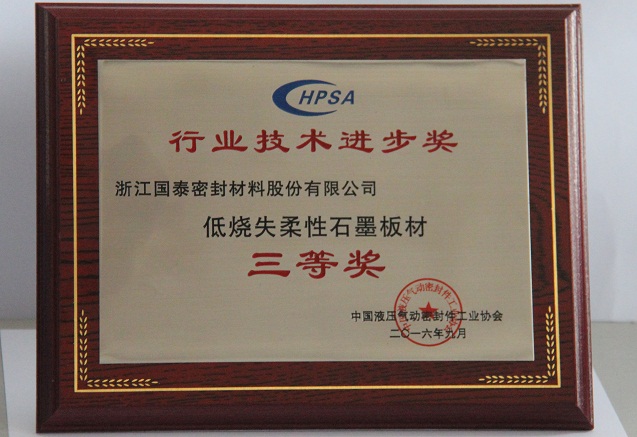 2016年度液压液力气动密封行业技术进步奖评奖项目于近日正式揭晓。由我司常务副总经理兼总工程师吴益民领衔,孙李超、王仕江、沈铁伟、章佳红、丁锋、曹岳强署名申报的项目“低烧失柔性石墨板材”,荣获2016年度液压液力气动密封行业技术进步三等奖。